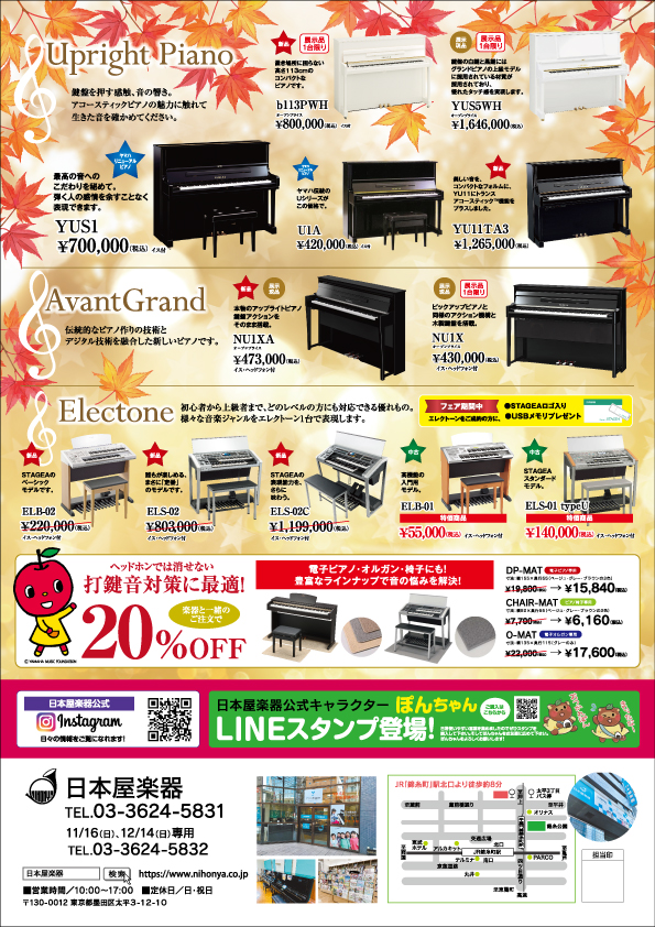◇展示会・セールに関するお問い合わせ:03-3624-5831/日本屋楽器
